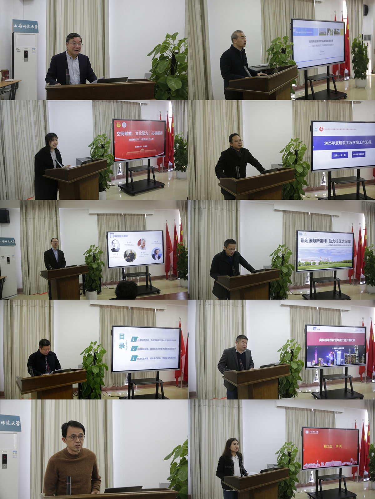 奉贤校区管委会副主任施家仓作2025年度管委会工作汇报,从突出政治引领、提升综合保障、打造平安校园、建设校园文化、加强区校联动等五个方面梳理了年度的工作重点并展望了2026年的工作规划。聚焦助力奉贤校区大保障系统功能提升和本部门工作规划以及设想,校团委书记黄雨艳、资产与实验室管理处处长王昀、基建规划处处长陆伟、后勤服务中心主任徐志欣、校工会常务副主席李凤、心理学院院长蔡丹、体育学院院长薛原、建筑工程学院院长胡振以及商学院副院长姚亚伟等分别作交流发言。