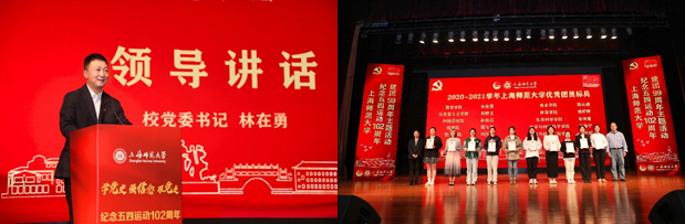 为纪念五四运动102周年、建团99周年,深入学习习近平新时代中国特色社会主义思想、党的十九大、十九届五中全会精神,在全团加强落实“学党史、 强信念、跟党走”主题学习教育,4月28日,学校在奉贤校区大剧院举办上海师范大学五四表彰大会,校领导、团市委领导、校团委专兼职团干部、各学院分管学生工作副书记、团委书记副书记、学生代表等出席此次大会。